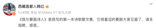 今(30)日上午,歌手韩红在微博发文,宣布自己的新书出版:“《我与蒙面诗人》是我写的第一本诗歌散文集,它很羞涩的要跟大家见面了,请多指教,感恩。”