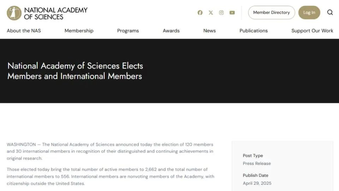 20。 《屠呦呦当选美国科学院外籍院士》(百度百家号,2025-04-30)