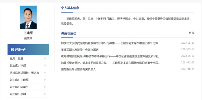 在深交所任职5年多以后,王建军于2021年10月重回证监会,出任证监会副主席,至今三年有余。截至发稿,证监会官网领导班子信息暂未更新,王建军仍在副主席名列中。