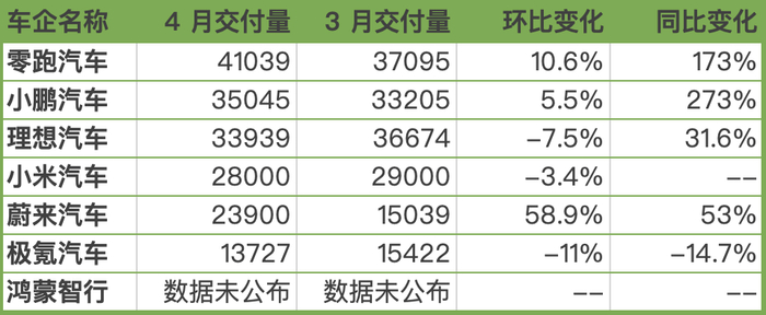 新势力4月销量出炉:零跑逾4万辆再夺冠,蔚来环比增近六成,小米下滑