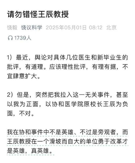 5月1日,现任北京大学教授的饶毅在其个人公众号发文《请勿错怪王辰教授》。其中提到:“确实,我批评过协和医学院,但我从来没有说过协和医学院‘乌烟瘴气’。我肯定协和医学院曾经非常优秀,但也不讳言其后来下滑。”