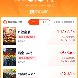 新京报讯(记者滕朝)据灯塔专业版,截至5月2日18时58分,2025年五一档新片(含重映)总票房(含点映及预售)达3.61亿,影片《水饺皇后》《猎金·游戏》《雷霆特攻队*》《人生开门红》《幽灵公主》《苍茫的天涯是我的爱》暂列前六。