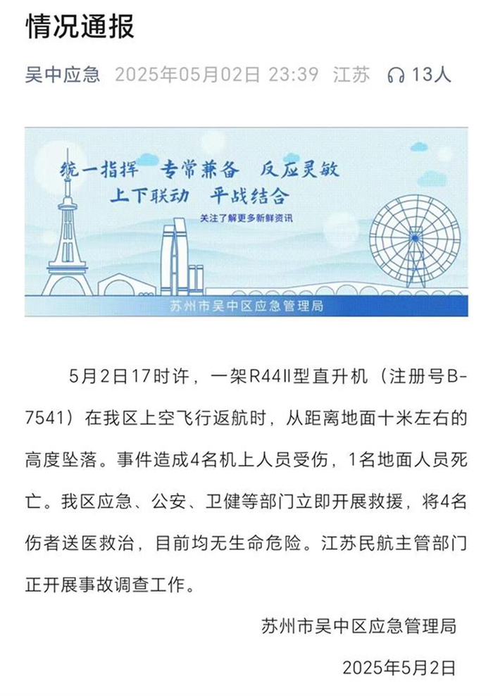 据苏州市吴中区应急管理局通报,5月2日17时许,一架R44Ⅱ型直升机(注册号B-7541)在吴中区上空飞行返航时,从距离地面十米左右的高度坠落。事件造成4名机上人员受伤,1名地面人员死亡。吴中区应急、公安、卫健等部门开展救援,将4名伤者送医救治,目前均无生命危险。江苏民航主管部门正开展事故调查工作。