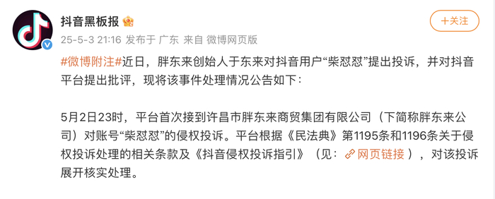 5月2日23时,平台首次接到许昌市胖东来商贸集团有限公司(下简称胖东来公司)对账号“柴怼怼”的侵权投诉。平台根据《中华人民共和国民法典》第1195条和第1196条关于侵权投诉处理的相关条款及《抖音侵权投诉指引》,对该投诉展开核实处理。