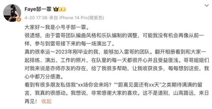 告别文章里,她回顾了自己2023年毕业后加入团队排练、演出的点滴时光。她坦言,在赵雷的团队中,每一天都很开心并且受益匪浅,自己得到了很多帮助,也收获良多。