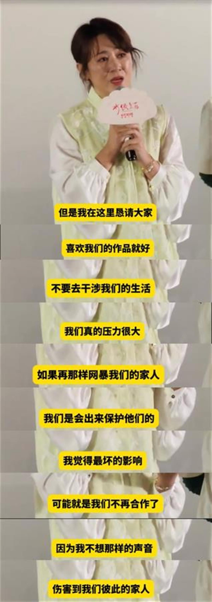 马丽恳请大家:“喜欢我们的作品就好,不要去干涉我们的生活,我们真的压力很大。因为我觉得那样的心态是不对的,我们要给彼此一个创作的空间。如果再那样网暴我们的家人,我们是会出来保护他们的。我也会崩溃,我觉得最坏的影响可能就是我们不再合作了,因为我不想那样的声音伤害到我们彼此的家人。”