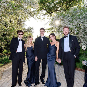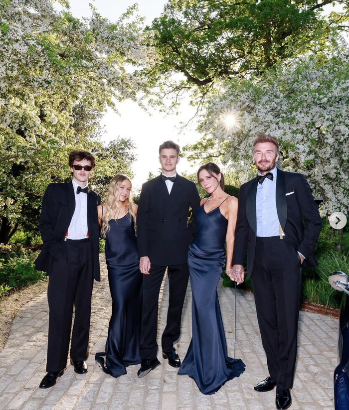 照片中,贝克汉姆和两个儿子都西装革履,女儿Harper Seven Beckham(小七)和妻子维多利亚身穿同款蓝色礼裙,一家人看上去幸福满满。