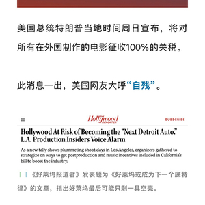【#美国征收100%电影关税的8个恶果# 】#好莱坞会不会是下一个底特律# 特朗普宣布,将对所有在外国制作的电影征收100%的关税。电影属于服务贸易,服务贸易是无形的,所以一般认为服务贸易没有关税。特朗普政府以所谓保护美国电影的旗号对进口影片征收巨额关税,其“回旋镖效应”必然令美国电影遭受全世界的反制。