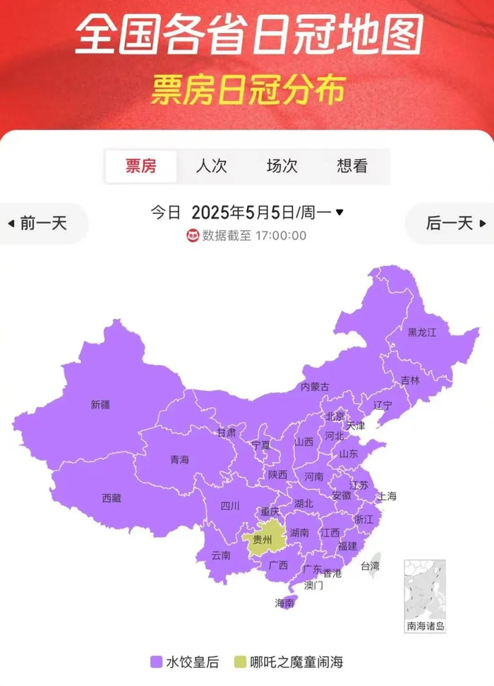 这个五一假期,11部影片集中上映,《哪吒2》凭借超高口碑与观影黏性保持竞争力。假期第二天,《哪吒2》票房实现逆跌,单日票房超1795万元,以6.3%的排片占比贡献10.2%的票房占比,上座率高达11%。假期五天,《哪吒2》在贵州更是强势领跑。