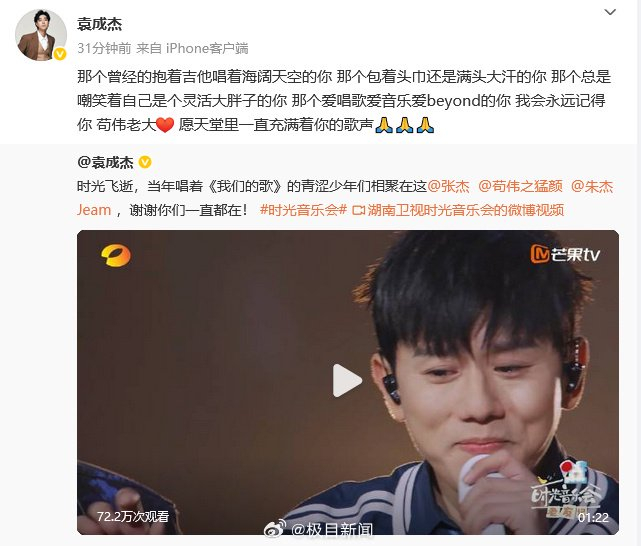 5月7日,@袁成杰 发文:那个曾经的抱着吉他唱着海阔天空的你 那个包着头巾还是满头大汗的你 那个总是嘲笑着自己是个灵活大胖子的你 那个爱唱歌爱音乐爱beyond的你 我会永远记得你 苟伟老大