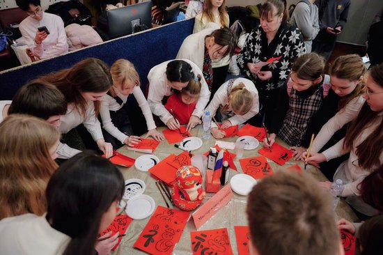 2025年2月3日,俄罗斯圣彼得堡学生在中小学春节联欢节上体验中国书法。