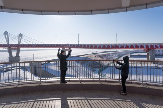 2024年1月30日,游客在黑龙江省黑河市黑龙江大桥公园内的观光塔上留影。黑河—布拉戈维申斯克黑龙江大桥于2022年6月10日正式通车,是中俄首座跨黑龙江(俄罗斯称阿穆尔河)界河公路桥,在中国东北地区和俄罗斯远东地区之间开辟了新的国际运输通道。
