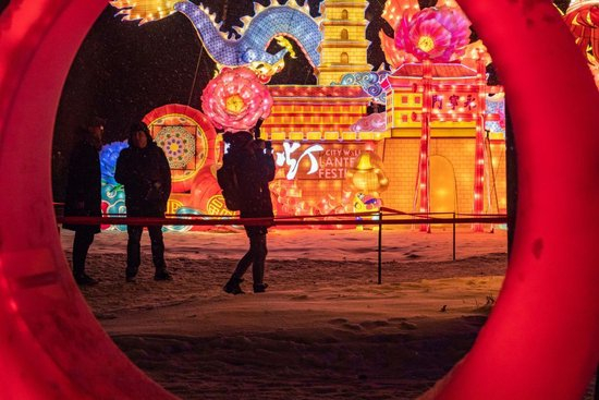 2019年12月4日,在俄罗斯首都莫斯科的中国彩灯节上,观众拍摄来自中国四川省自贡市的彩灯作品。