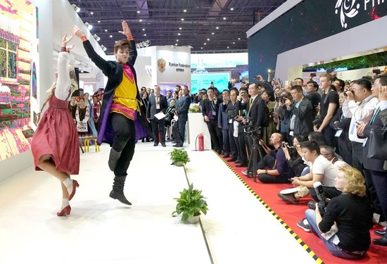 2018年11月6日,俄罗斯演员在上海举行的首届中国国际进口博览会俄罗斯展区表演舞蹈。