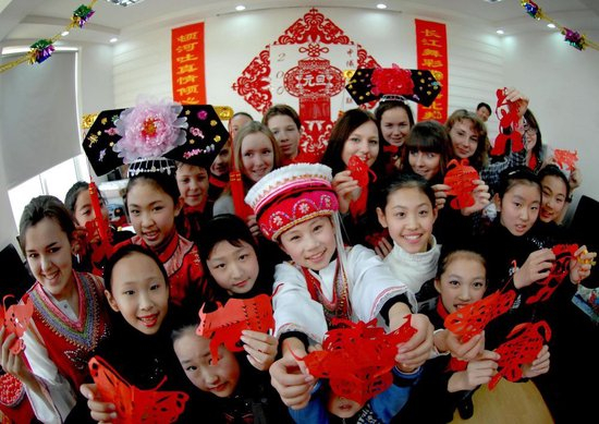 2008年12月30日,中俄学生在沈阳“莫斯科学生体验中国冬令营”活动上展示自己的剪纸作品。