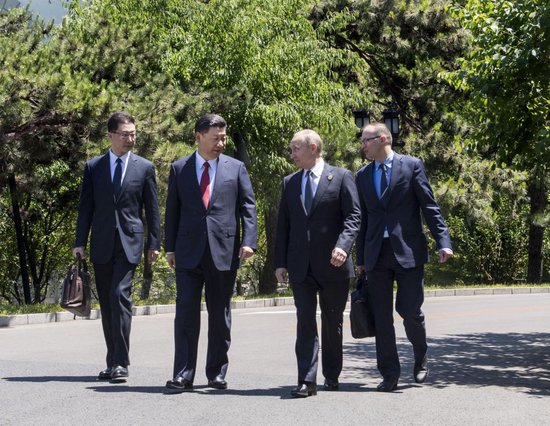 2017年5月14日,国家主席习近平在北京钓鱼台国宾馆会见来华出席“一带一路”国际合作高峰论坛的俄罗斯总统普京。会见后,习近平同普京在钓鱼台国宾馆散步。