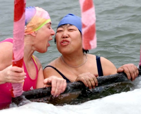 2002年1月15日,多次来华参加冬泳赛事的俄罗斯选手柳德米拉(左),在第二届哈尔滨国际冬泳邀请赛上亲吻老朋友、好姐妹——中国女队员杨翠芬。