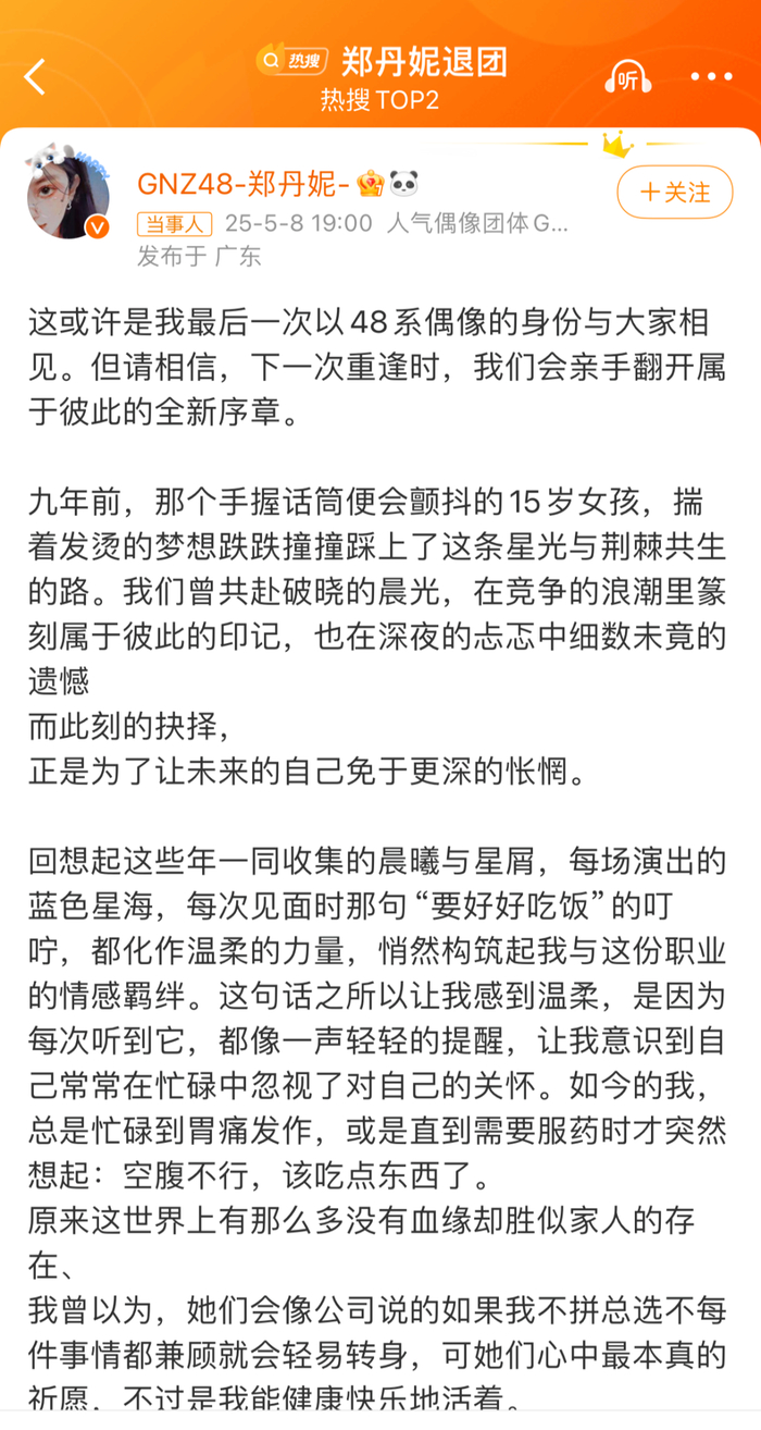 2025年5月8日,GNZ48成员郑丹妮通过个人微博发布长文宣布退团,结束长达九年的偶像生涯。