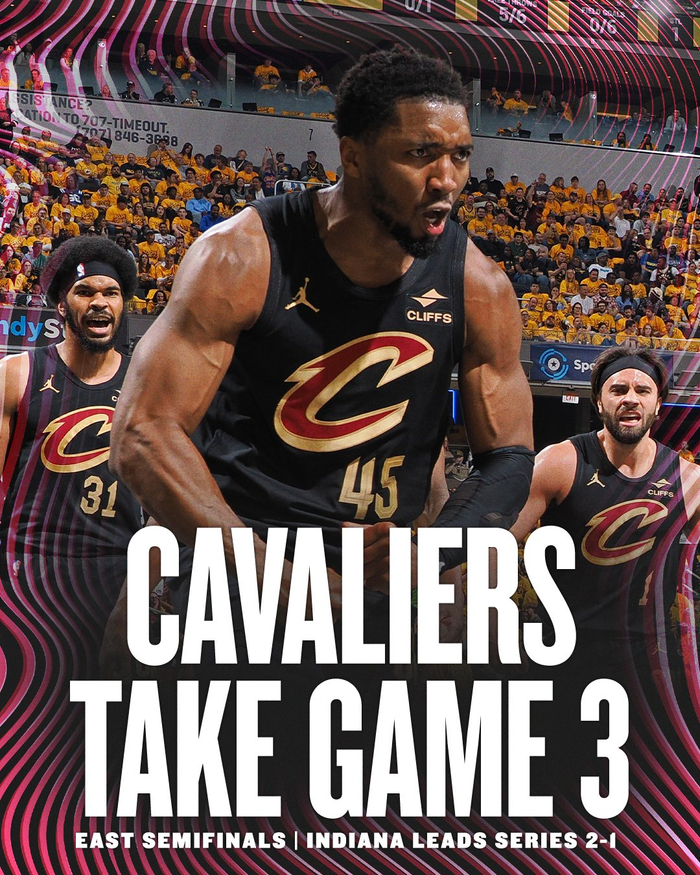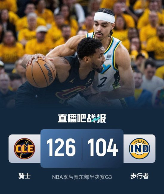 比赛开始,骑士反客为主打出11-0梦幻开局,特纳连续内线强打砍下10分止血,随后麦康纳上来连续送助攻,联手马瑟林带队抹平15分分差,次节步行者突然断电4分钟内未得分,米切尔、加兰和阿伦连续攻击内线重新拉开双位数领先,随后骑士继续发力半场领先到20分以上。下半场,双方围绕20分左右分差展开拉锯战,步行者连续反击后内姆哈德里突外投连砍7分继续缩小分差,但骑士回应9-0稳住18分领先,末节西亚卡姆里突外投连砍9分带队追到差11分,米切尔和斯特鲁斯连续三分迅速回应,随后米切尔连续杀内线带队守住20分以上领先,双方逐渐练兵,最终骑士126-104大胜步行者,大比分扳成1-2。