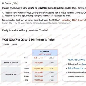 据科创板日报5月10日消息,苹果向渠道商下发了调价通知,这也是苹果首次在周六宣布调价。苹果iPhone 16 Pro Max所有容量版本降价160美元,对应1313.06元人民币;而iPhone 16 Pro的128GB版本降价176美元,对应1445.27元人民币,其他版本同样降价160美元。