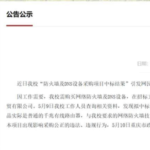 5月11日,重庆三峡学院发布情况说明称,近日我校“防火墙及DNS设备采购项目中标结果”引发网民质疑,学校高度重视,成立专项工作组开展核实。鉴于本项目出现影响采购公正的违法、违规行为,5月10日重庆市政府采购网已发布采购终止公告。感谢社会各界的关心和监督。(据5月11日极目新闻报道)