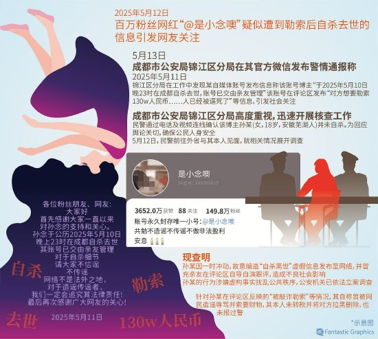 2025年5月10日,拥有149.8万粉丝的抖音博主@是小念噢(孙某)通过账号发布“遗书视频”,声称因遭勒索130万元自杀身亡。其“亲友”在评论区控诉犯罪细节,迅速引发全网关注。经成都警方调查,该事件实为孙某自导自演的虚假闹剧,目前公安机关已介入处理,或将追究其法律责任。