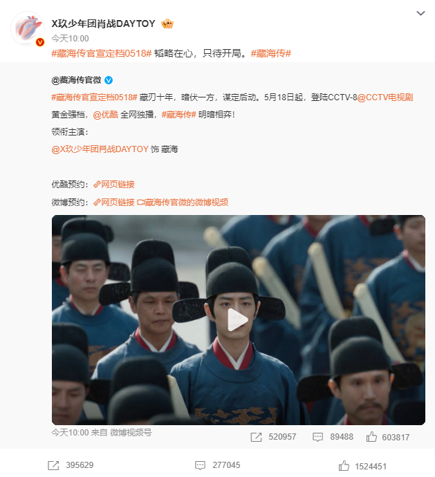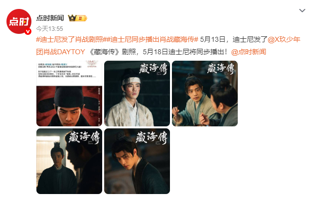 5月13日,迪士尼发了@X玖少年团肖战DAYTOY 《藏海传》剧照,5月18日迪士尼将同步播出!