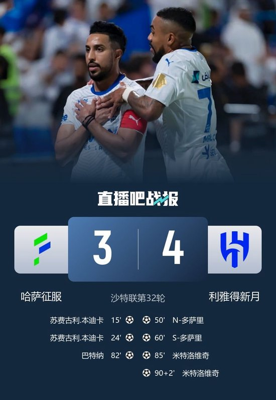 直播吧5月17日讯 北京时间5月16日23:55,沙特联第32轮,利雅得新月客场对阵哈萨征服。上半场,苏费古利-本迪卡头球梅开二度,米特洛维奇点球被取消;下半场,N-多萨里扳回一球,S-多萨里扳平比分,巴特纳破门助哈萨征服再度领先,米特洛维奇连入两球,巴尔加斯绝平球被吹。最终,利雅得新月4-3哈萨征服,积71分排名第二,哈萨征服积33分排名第13位。