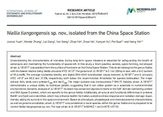 新京报讯 据中国载人航天官微消息,近日,科研人员首次公布在我国空间站发现的一个微生物新物种,并将其命名为“天宫尼尔菌(Niallia tiangongensis)”,相关科研成果在线发表于国际权威期刊《International Journal of Systematic and Evolutionary Microbiology》上。