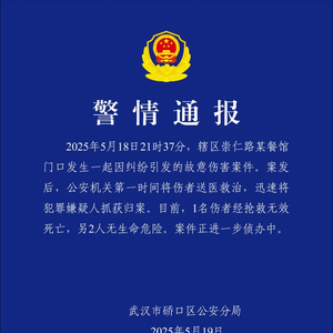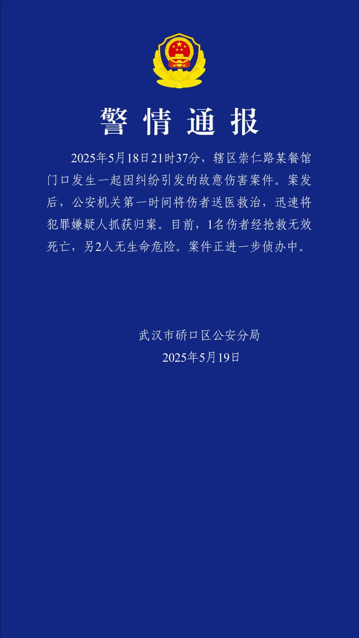 新京报讯 据平安硚口微信公众号消息,2025年5月18日21时37分,辖区崇仁路某餐馆门口发生一起因纠纷引发的故意伤害案件。案发后,公安机关第一时间将伤者送医救治,迅速将犯罪嫌疑人抓获归案。目前,1名伤者经抢救无效死亡,另2人无生命危险。案件正进一步侦办中。