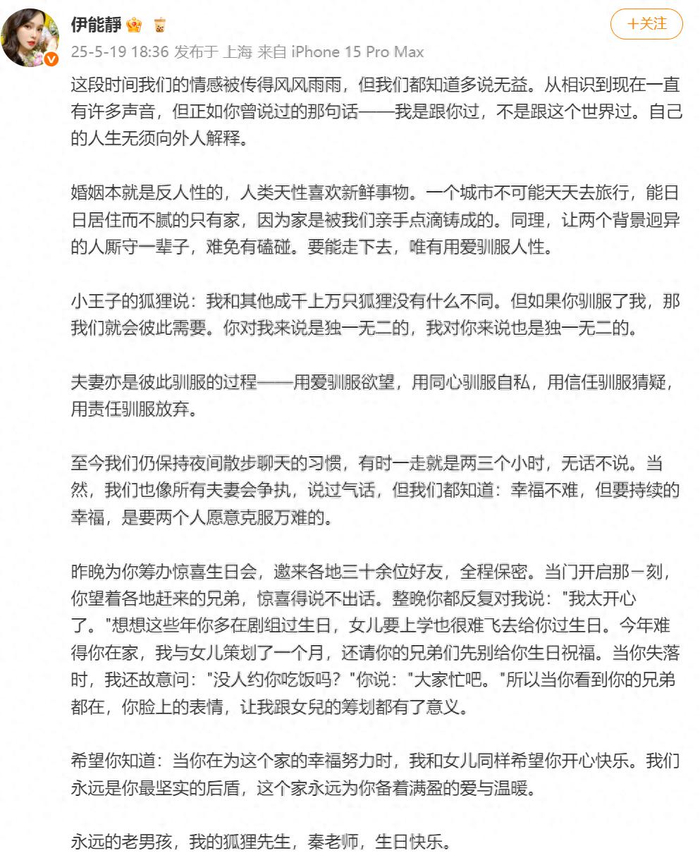 5月19日,伊能静发长文为47岁秦昊庆生,否认婚变:“这段时间我们的情感被传得风风雨雨,但我们都知道多说无益。从相识到现在一直有许多声音,但正如你曾说过的那句话——我是跟你过,不是跟这个世界过。自己的人生无须向外人解释。”