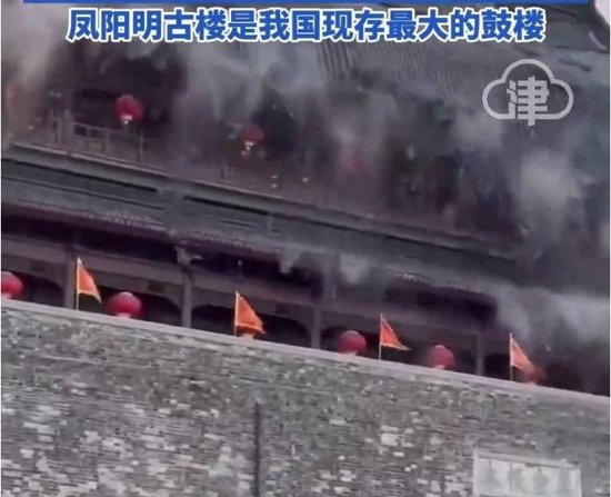 安徽凤阳:鼓楼楼宇顶部一侧瓦片部分脱落,无人员伤亡