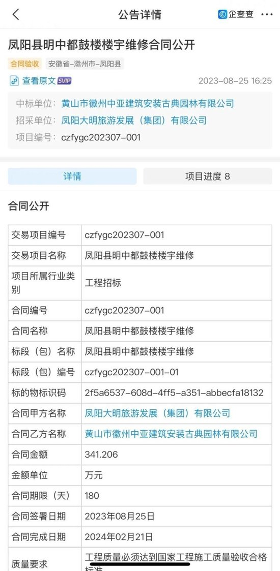 记者查询“企查查”发现,凤阳大明旅游发展(集团)有限公司于2023年4月25日发布该楼楼宇的维修招标公告,由黄山市徽州中亚建筑安装古典园林有限公司中标所得,合同签署日期为2023年8月25日,完成日期是2024年2月21日。但根据黄山市建筑协会官网发布的信息显示,该项目最终“于2024年6月5日通过竣工验收,得到业主单位及社会各界人士一致好评”。