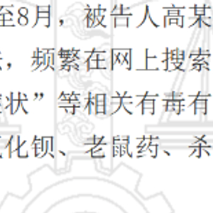 公开的判决书显示,经审理查明,2024年5月至8月,被告人高某因家庭矛盾产生轻生,并与其丈夫赵某某同归于尽的想法。于是,频繁在网上搜索“如何使人致癌、慢性中毒”、“鼠药兑水慢性中毒的症状”等相关有毒有害物质信息的词条,并在购物网站多次购买氯化钡、老鼠药、杀虫剂、黄曲霉素等有毒物品,欲毒害赵某某。