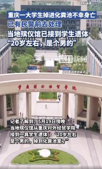 5月19日,重庆对外经贸学院有学生掉进化粪池不幸身亡,引发关注。极目新闻记者采访了解到,涉事学生为一名男生,遗体已于当日送往殡仪馆。
