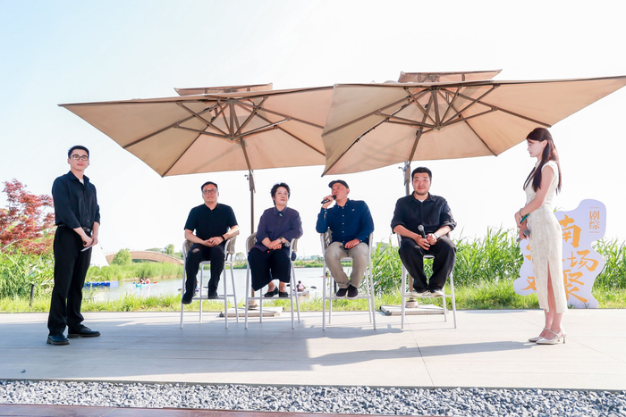 《江南·十二场欢聚》短视频综艺的四位总编辑(坐者左二为张越)在发布会现场。
