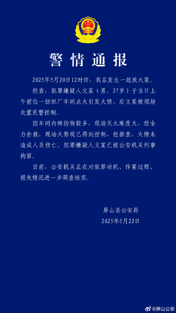 一男子在纺织厂车间放火被刑拘 四川屏山警方:未造成伤亡