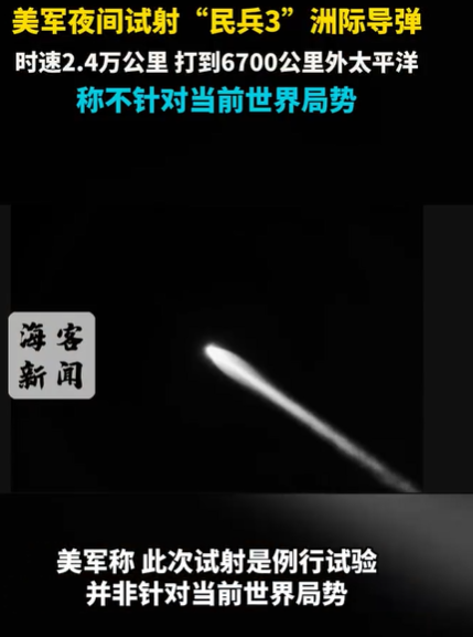 [美军夜间试射民兵3洲际导弹:时速2.4万公里 打到6700公里外太平洋 称不针对当前世界局势]据《纽约邮报》报道,5月21日,美军试射一枚未携带弹头的“民兵3”洲际弹道导弹。#美军洲际导弹试射飞行超6700公里#