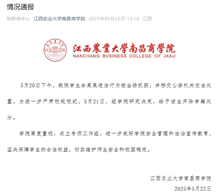 近日,多位网友发帖称江西一高校男生涉嫌在女厕所偷拍女生。5月22日,江西农业大学南昌商学院发布情况通报称,20日下午,该校学生余某某违法行为被当场抓获,并移交公安机关依法处置。为进一步严肃校规校纪,5月21日,经学院研究决定,给予该生开除学籍处分。