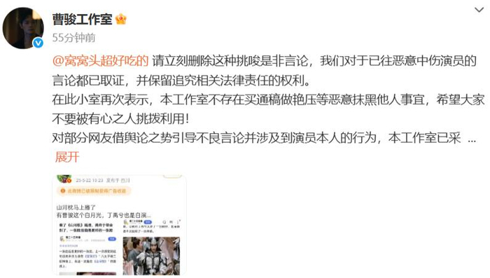 5月22日,曹骏工作室发文否认买通稿艳压抹黑他人,称对恶意中伤言论已取证。