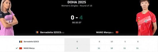 四局比分分别为:11-6、12-10、11-5、11-6。本场比赛耗时33分,与昨天的1/16决赛相比,王曼昱今天赢的更加轻松。
