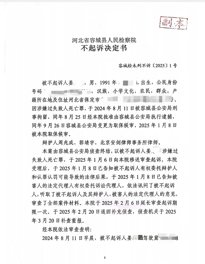 记者看到,《不起诉决定书》上显示,被不起诉人姜某,1991年出生,因涉嫌过失致人死亡罪,于2024年8月11日被容城县公安局刑事拘留,同年8月25日经该院批准由容城县公安局执行逮捕,同年9月26日容城县公安局变更为取保候审,2025年1月8日被该院取保候审。