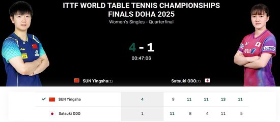 直播吧05月23日讯 世乒赛女单1/4决赛,世界排名第1的孙颖莎,对阵世界排名第8的大藤沙月,最终孙颖莎4-1逆转大藤沙月,晋级世乒赛女单4强。