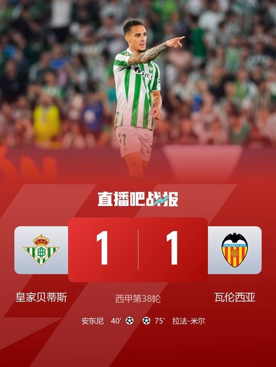 4轮不胜!贝蒂斯1-1瓦伦西甲第6收官 安东尼兜射破门+表白贝蒂斯