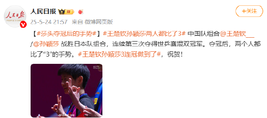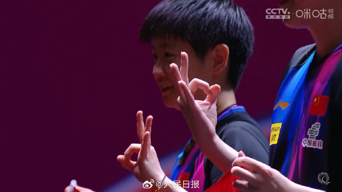 [#莎头夺冠后的手势#]#王楚钦孙颖莎两人都比了3# 中国队组合@王楚钦___ /@孙颖莎 战胜日本队组合,连续第三次夺得世乒赛混双冠军。夺冠后,两个人都比了“3”的手势。#王楚钦孙颖莎3连冠做到了#,祝贺!
