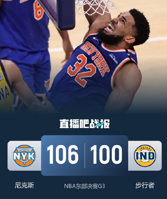 比赛开始,尼克斯将罗宾逊提到首发起到作用,但特纳和谢泼德连续三分回应,随后双方比分持续胶着,麦康纳联手内姆哈德助队首节领先4分,次节唐斯连续攻内线终于取分,但步行者全民皆兵回应小高潮,随后步行者挑战成功后又是一波13-0直接领先到20分,阿努诺比和布里奇斯连续三分半场追到13分。下半场,阿努诺比压哨三分追到差10分,但步行者6-0稳住局势,内史密斯崴脚受伤,麦克布莱德个人轰出7-0追到个位数分差,末节唐斯上来里突外投连砍15分带队直接反超比分,哈利伯顿三分止血,唐斯不讲理三分还能进扩大领先,随后双方连续走上罚球线,比赛进入白热化,布伦森抛投领先2分,特纳和西卡接连关键三分不中,最终尼克斯106-100险胜步行者,大比分扳成1-2。