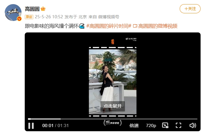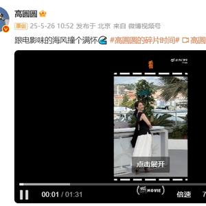 5月26日,女演员高圆圆在个人社交账号发布视频,回顾戛纳之旅,并配文:“跟电影味的海风撞个满怀”。