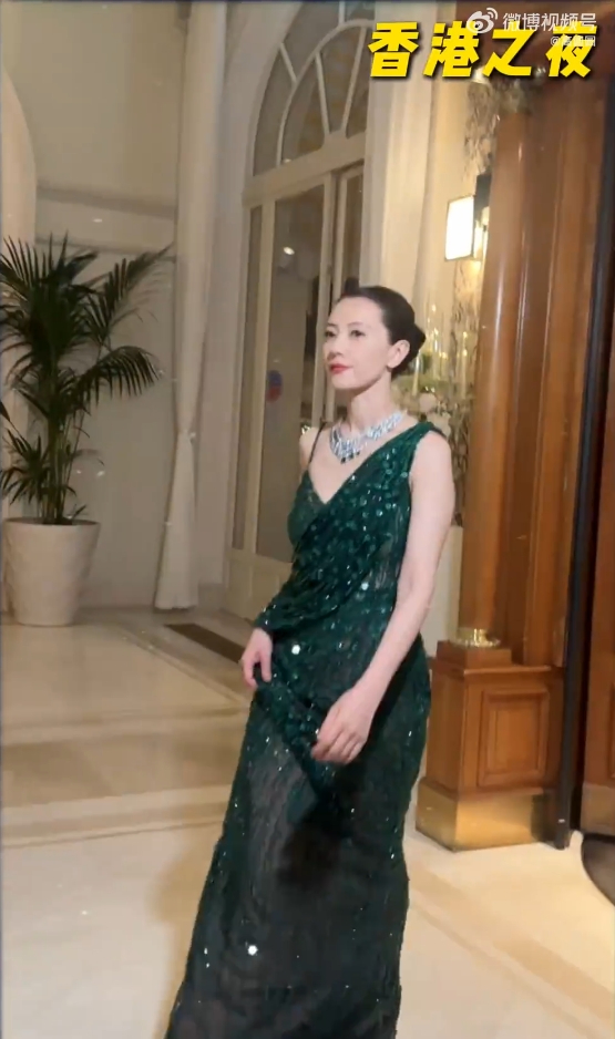 高圆圆一身宝蓝色抹胸长裙超闪耀,大波浪卷发随性散落肩上尽显优雅气质。
