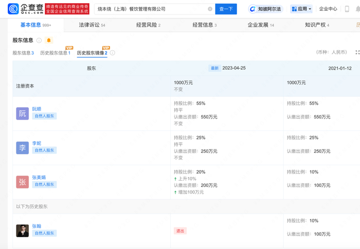 企查查最新信息显示,烧本烧(上海)餐饮管理有限公司成立于2021年1月,注册资本1000万,张翰作为创始股东曾持有10%股份,却在2023年4月悄然退出。此时距离公司首次被限制高消费仅隔半年,时间线的微妙重叠引发市场诸多揣测。