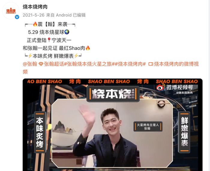 2021年5月,“烧本烧”本味烧肉店在宁波正式开业时,号称“筹备已久”“全球首店”,张翰作为该品牌“火星烤肉主理人”曾出镜为其宣传。据烧本烧官网信息,张翰携张柏芝、李治廷等明星好友共同参与了品牌发布会,不少网红、kol前来助力,现场粉丝情绪高涨,整个开幕仪式十分顺利。